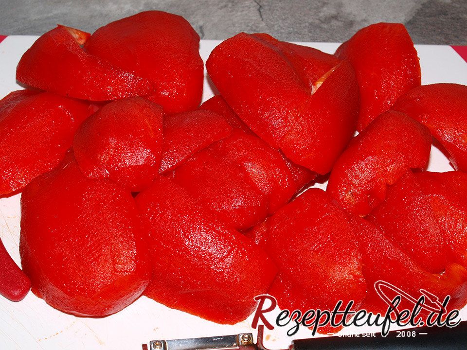 - Die Schale von den Paprikaschoten mit einem Sparschäler entfernen. Die Paprikaschoten in Stücke von ca. 2 x 2 cm schneiden. Ebenso mit den Auberginen verfahren (schälen und in Stücke schneiden). Den Knoblauch schälen und in Scheiben schneiden. Die Chilischote entkernen und in Streifen schneiden.1 kg rote Paprika, 350 g Auberginen, 3 Zehen Knoblauch, 0.5 Chilischote