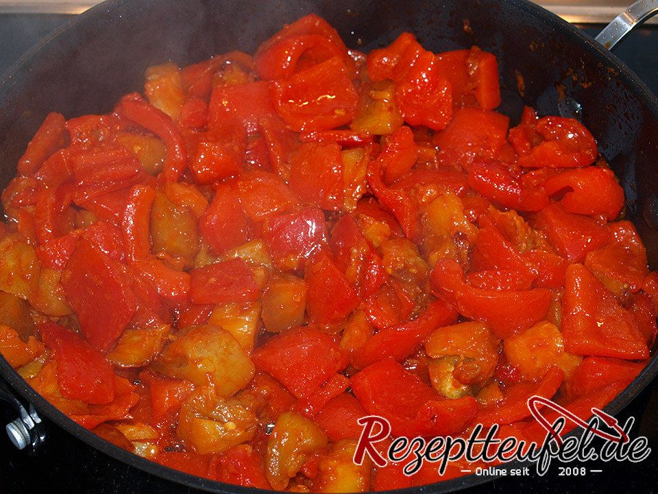 - Die Paprikastücke und Auberginenwürfel nach ca. 30 Minuten