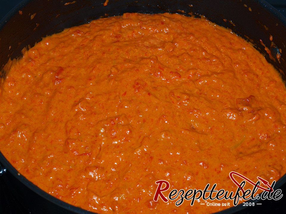 - Den Deckel auf das Kochgefäß geben und das Gemüse ca. 70 Minuten leicht köcheln lassen. Immer wieder umrühren, damit die Masse nicht anbrennt. Das Ajvar entweder so lange köcheln bis die Paprikastücke von alleine zerfallen oder die Masse mit einem Pürierstab zerkleinern.