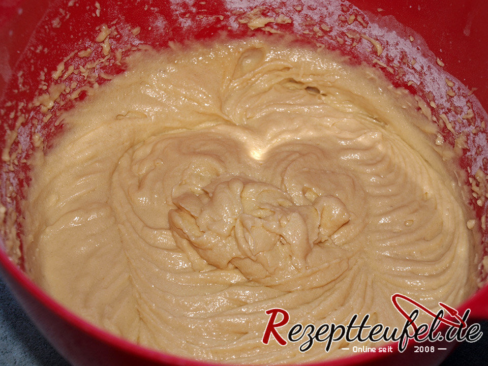 - Die Butter schaumig rühren, nach und nach den Zucker, Eier, Milch, Salz, Vanillezucker und Milch hinzufügen. Das mit dem Backpulver vermengte Mehl unterrühren.
