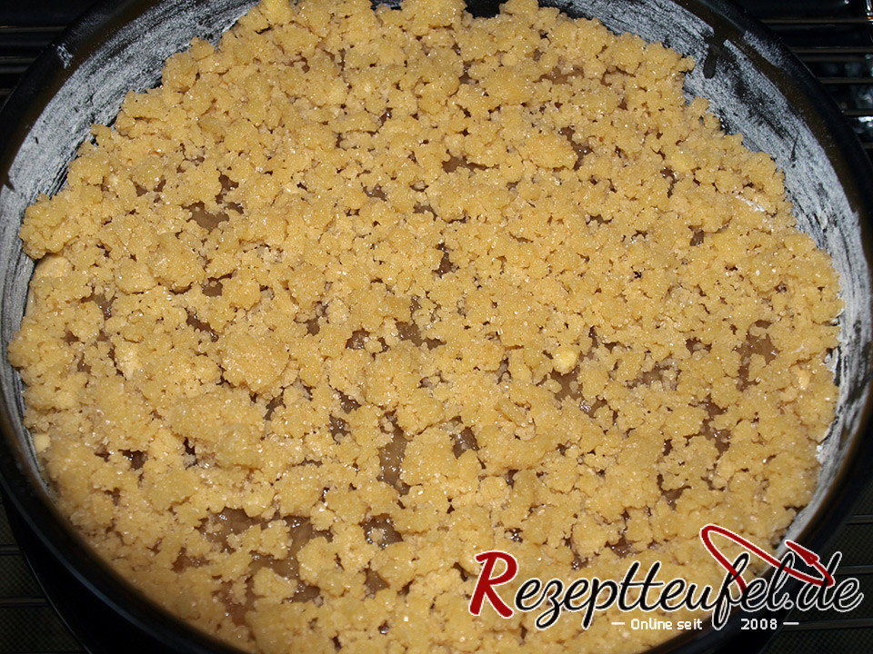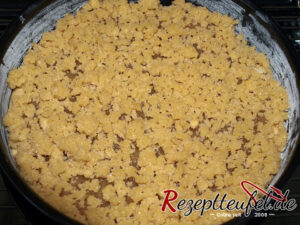 - Für die Streusel werden die Zutaten vermengt bis sie sich zu groben Streuseln verbunden haben, diese werden bis zum Rand auf den Teig mit dem Apfelmus verteilt.