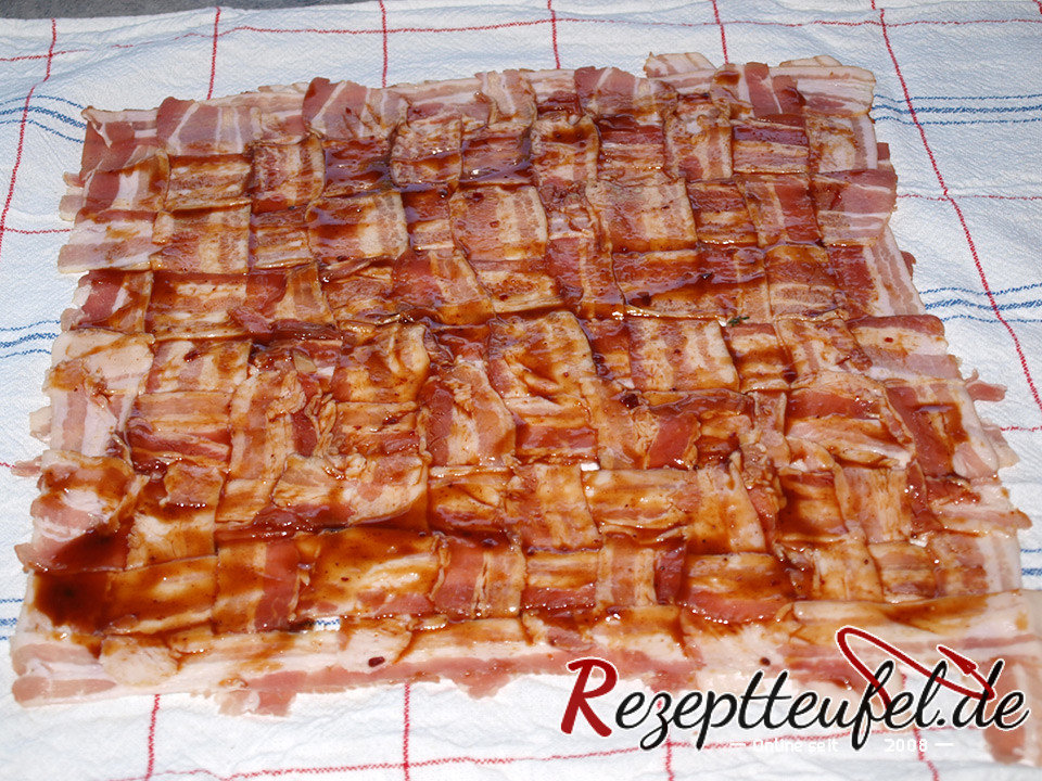 - Aus dem Bacon auf einem Handtuch bzw. Trockentuch ein Viereck flechten. Das Geflecht dünn mit Soße bestreichen, darauf die Hackfleischmasse ausbreiten und flach drücken.