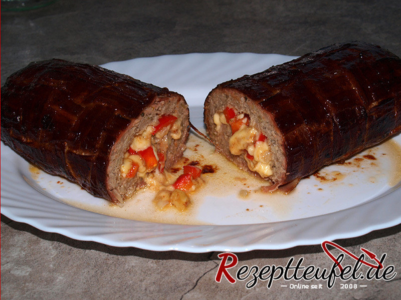 Eine Bacon Bomb mit einer Füllung aus Käse und Paprika, im Grill leicht geräuchert und langsam bei niedriger Temperatur gegart.