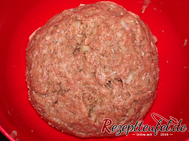 - Alle Zutaten für die Hackfleischmasse vermengen, bis das Eiweiß des Hackfleisches sich verbindet und die Hackfleischmasse eine kompakte Konsistenz hat.