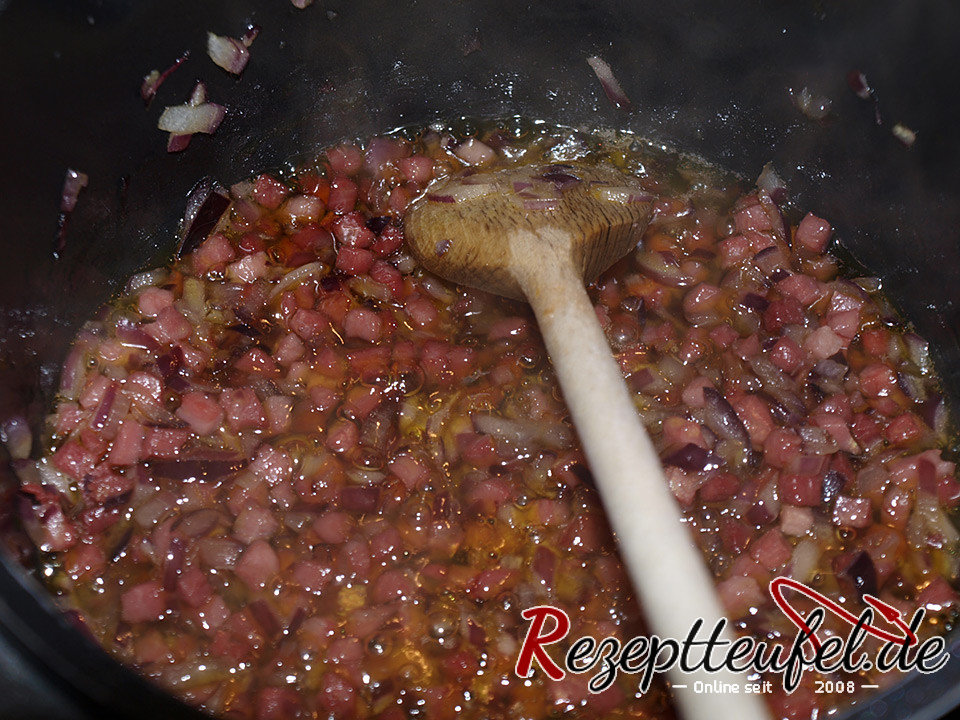 - Die geschälte Zwiebel und den geräucherten Schinken in feine Würfel schneiden. Das Öl in eine kleine Pfanne geben und die Zwiebel- und Schinkenwürfel darin bei geringer Hitze schmoren bis die Zwiebeln glasig sind.