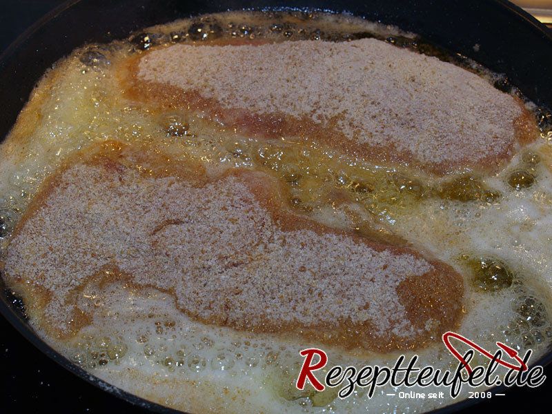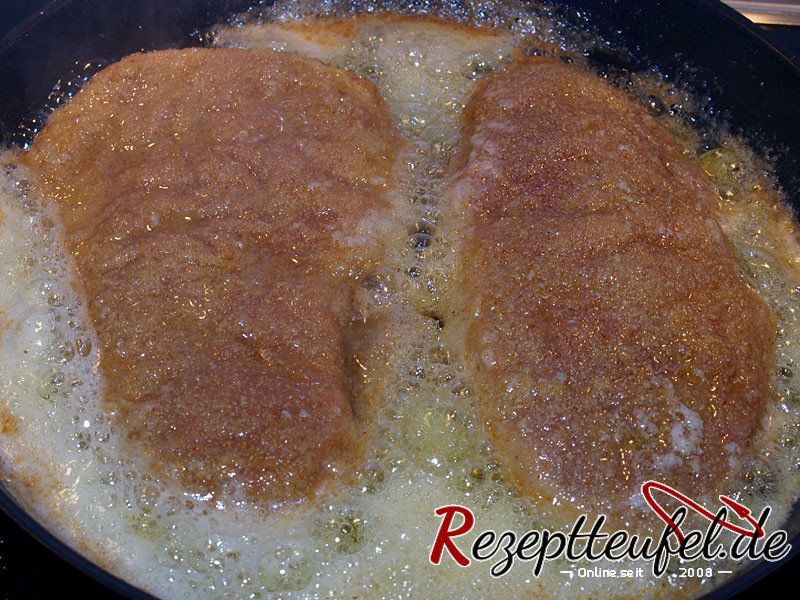 Um eine luftige und knusprig gebratene Umhüllung zu erreichen, werden die gefüllten Schnitzel in viel Butterschmalz oder Öl (mit einem guten Stück Butter versehen) ausgebraten. Dabei wird die ungebratene Seite immer wieder mit dem heißen Fett aus der Pfanne übergossen, damit die Panade aufbläht.