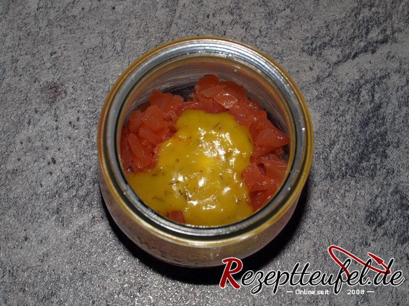 Butter - Den Lachs in Streifen schneiden und in das ausgefettete Weckglas füllen, darauf die Honig-Senf-Dill-Soße auf den Lachs geben.Das Ei aufschlagen (ohne das Eigelb zu verletzen) und vorsichtig auf den Lachs und die Soße in das Glas laufen lassen. Auch hierbei sollte nach Möglichkeit das Eigelb nicht verletzt werden, sondern heil im Glas landen. Einige Dillspitzen auf das rohe Ei geben.50 g Räucherlachs, 15 g Honig-Senf-Dill-Soße, 1 Ei, Dillspitzen