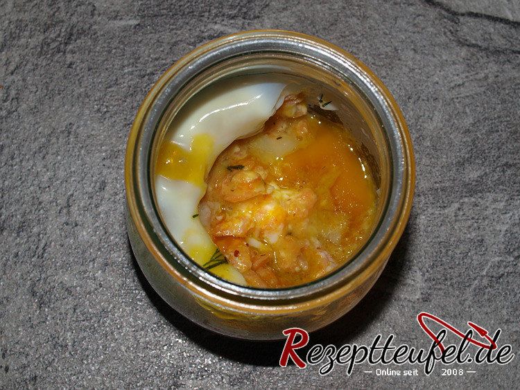 - Den Deckel des Weckglases auflegen, es werden dabei weder die Gummis noch die Klammern verwendet. Das Weckglas in eine Schale geben, die nun ca. 3 cm hoch mit heißem Wasser gefüllt wird. Diese Schale in den Backofen geben und das Ei in ca. 10 Minuten garen. Das Eigelb sollte noch flüssig sein, das Eiweiß jedoch fest.