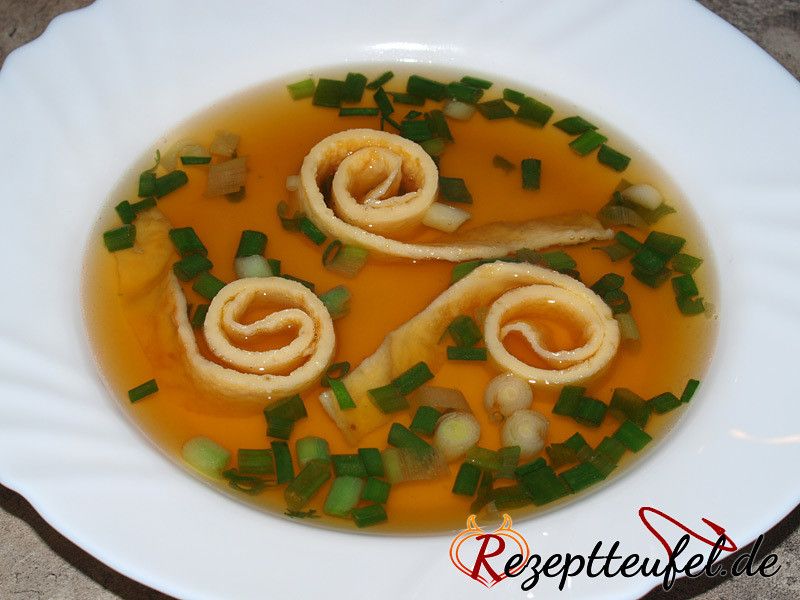 In puncto Einlage gibt es ebenfalls unterschiedliche Ansichten, unserer Meinung nach ist erlaubt, was gefällt und somit gab es bei uns schon Flädlesuppe mit Suppengrün als Einlage, angeschmorten Zwiebelwürfel oder auch mit klein geschnittenen Lauchzwiebeln.