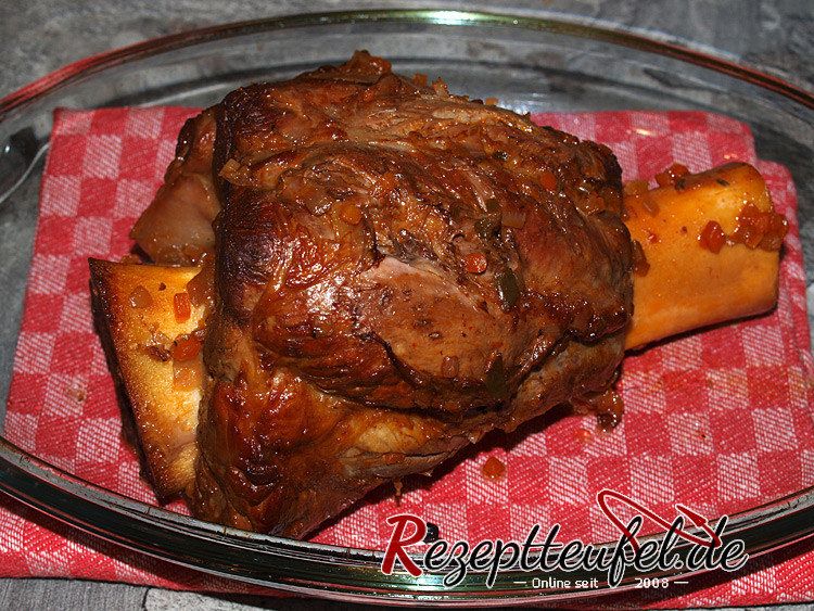 - Den Knochen aus dem Fleisch ziehen und das Fleisch in Scheiben schneiden. Jetzt kann das Fleisch entweder in der Soße oder als Fleisch und Soße getrennt serviert werden.