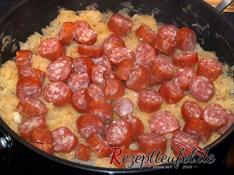 - Das Öl in eine beschichtete Pfanne geben und die halben Zwiebelringe darin andünsten. Das Sauerkraut auflockern und mit den Gewürze wie Lorbeerblatt, Wacholderbeeren, Pimentkörner und Zucker zu den Zwiebeln in die Pfanne geben.Den Deckel auf die Pfanne geben und das Sauerkraut auf mittlerer Hitze schmoren lassen, zwischendurch immer wieder umrühren. Der Vorgang dauert ca. 45 Minuten.Sobald das Sauerkraut Farbe angenommen hat die Mettwurststücke hinzufügen und unterheben, weitere 10 - 15 Minuten schmoren. Während dieser Zeit muss öfters umgerührt werden denn das Sauerkraut neigt dazu schnell eine sehr dunkle Farbe anzunehmen und wird somit leider auch bitter.850 g Sauerkraut, 5 EL Öl, 1 Lorbeerblatt, 2 Wacholderbeeren, 2 Pimentkörner, 3/4 TL Zucker