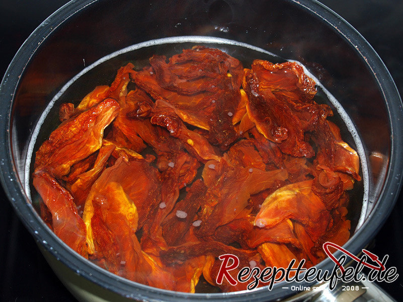 - Die Zutaten für den Sud aufkochen, die getrockneten Tomaten in den heißen Sud geben und 10 - 15 Minuten darin ziehen lassen.Die Tomaten in ein Sieb geben und 1 bis 2 Stunden gut abtropfen lassen, dabei weder drücken noch ausquetschen.