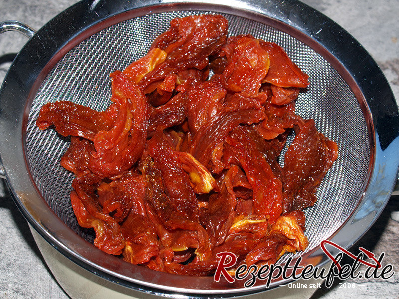Wir trocknen unsere Tomaten immer im Dörrautomaten oder Backofen, vakuumieren diese und haben so einen Vorrat, der bis zur nächsten Tomatensaison hält. Bei Bedarf öffnen wir eine Tüte mit getrockneten Tomaten und legen sie wie im Rezept beschrieben ein. Und in der nächsten Tomatensaison, ja dann wird neu getrocknet, vakuumiert und so weiter …
