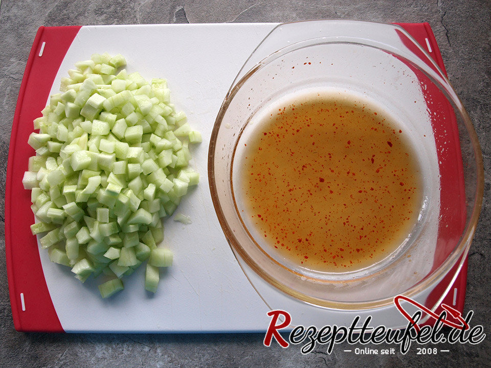 - Die Gurkenwürfel in das Dressing geben und gut untermengen.