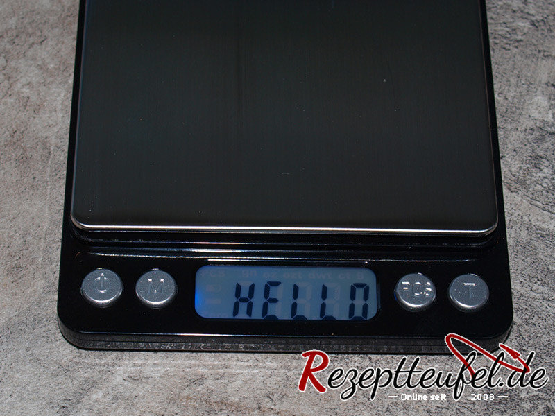 Sehr gut gefällt uns, dass auch ein Schüsselchen auf die Waage passt und wir trotzdem noch sehen können welches Gewicht angezeigt wird. So etwas ist bei Feinwaagen nicht selbstverständlich, denn oft sind die Aufstellflächen so klein, dass entweder kein Platz vorhanden ist oder aber man balanciert sein Gefäß bis es nicht mehr herunter fällt und sieht dann keine Anzeige mehr.