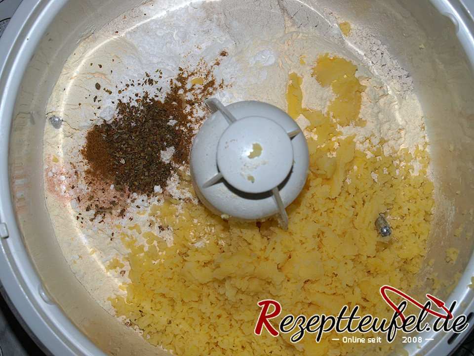 - Inzwischen die Kartoffeln durch die Presse drücken, mit den Mehlen, der Stärke und den Gewürzen in eine Schüssel geben.
