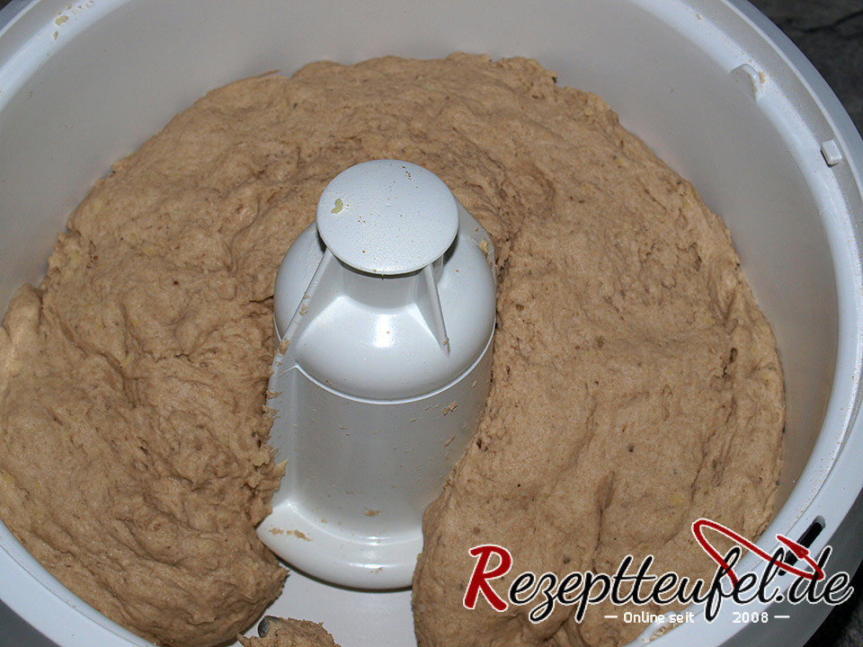 - Das Hefewasser dazugeben und alles zu einem geschmeidigen Teig verkneten. Den Teig zu einer Kugel formen, in eine Schüssel geben und mit einem feuchten Tuch abgedeckt ca. 1 Stunde gehen lassen bis sich der Teig verdoppelt hat.