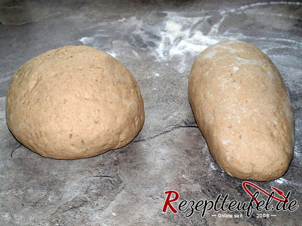 - Den Teig auf einer leicht bemehlten Arbeitsfläche durchkneten und in zwei Portionen aufteilen. Jedes Teigstück zu einer glatten Kugel und dann zu einem ovalen Brotlaib formen.