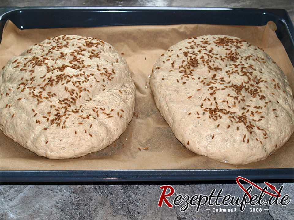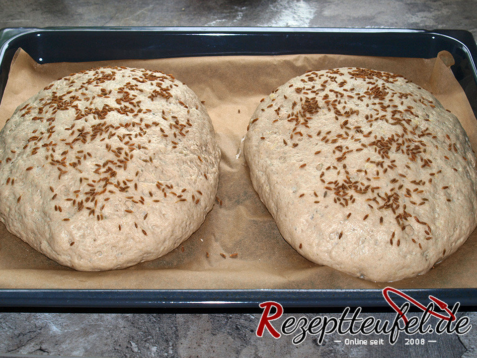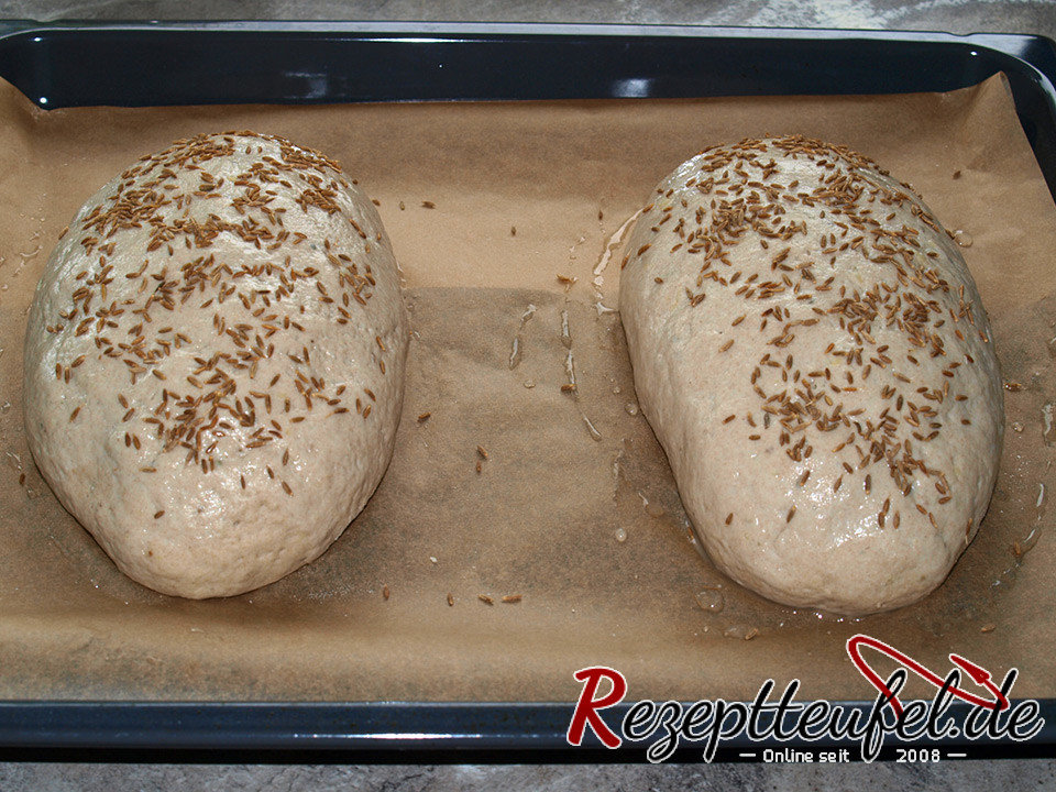 - Mit der feuchten Hand über die Oberfläche streichen und den Kümmel andrücken. Die Brotlaibe nebeneinander auf ein mit Backpapier ausgelegtes Blech legen, mit einem feuchten Tuch abdecken und nochmals ca. 45 Minuten gehen lassen bis sich der Teig verdoppelt hat.