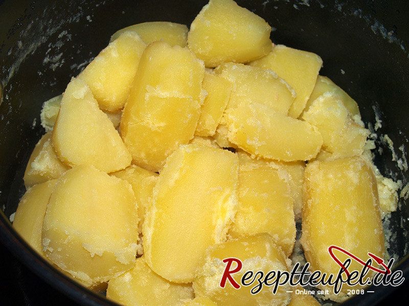 - Die geschälten mehligen Kartoffeln kochen und abdämpfen