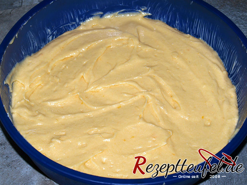 - Das Fett schaumig rühren, nach und nach den Zucker, die Eier, Milch und Gewürze hinzufügen. Das mit dem Backpulver vermengte Mehl unterrühren.