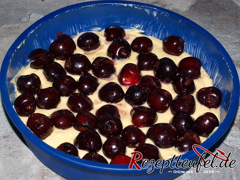 - Eine Springform mit dünn mit Backtrennmittel einstreichen oder mit Butter ausfetten und mit Mehl ausstreuen, den Kuchenteig in die Springform geben und glatt streichen. Die entkernten Kirschen auf dem Teig verteilen.