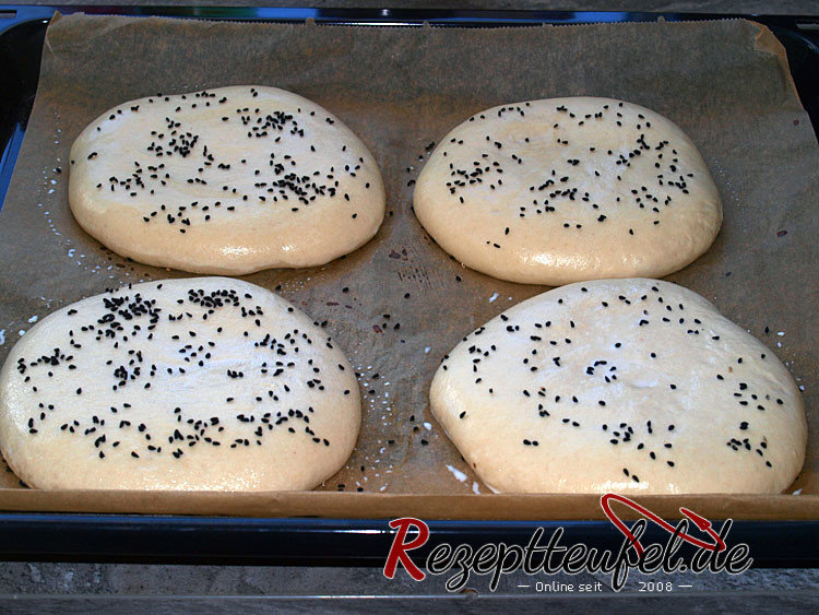 - Die Fladen direkt vor dem Backvorgang mit Milch bestreichen und mit wenig Sesam oder Schwarzkümmel bestreuen.Die Teigfladen in den Backofen schieben und sofort eine Tasse Wasser in die das mit aufgeheizte Gefäß oder direkt auf den Backofenboden gießen und die Fladen in 20 Minuten goldbraun backen. Auf einem Gitterrost auskühlen lassen.