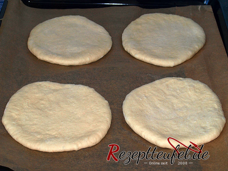 - Den Teig aus der Schüssel nehmen und auf einer leicht bemehlten Arbeitsfläche kurz durchkneten, dann in 6 gleichgroße Stücke von ca. 140 Gramm teilen. Jedes Teigstück zu einer Kugel formen, diese werden flach gedrückt und dann mit einem Nudelholz ausgerollt bis 0,7 cm dicke Fladen entstehen. Die Fladen auf mit Backpapier ausgelegte Backbleche legen, abdecken und nochmals ca. 45 Minuten gehen lassen.