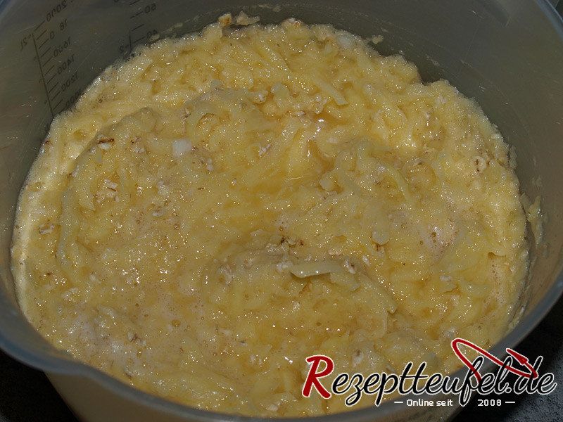 - Die geschälten Kartoffeln und die Zwiebel nicht zu fein reiben (es sollte kein feiner Brei entstehen aber auch nicht zu grob sein). Die Eier hinzufügen und mit den Haferflocken die Flüssigkeit binden. Die Kartoffelmasse mit Salz abschmecken.