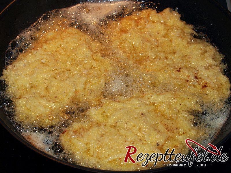 - Reichlich Fett in eine große Pfanne geben und erhitzen. Mit einem großen Löffel Teighäufchen in das Fett geben, diese flach drücken und knusprig braun braten, dabei einmal wenden.