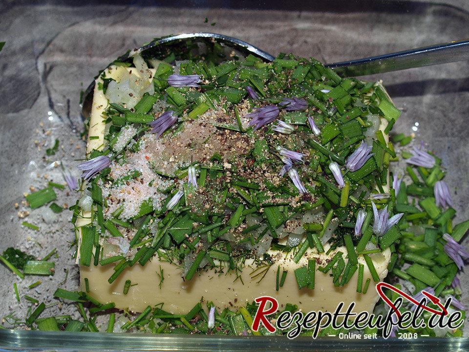 Dill, Petersilie, Schnittlauch, Schnittknoblauch und Schittlauchblüten finden ihren Platz in dieser Kräuterbutter.