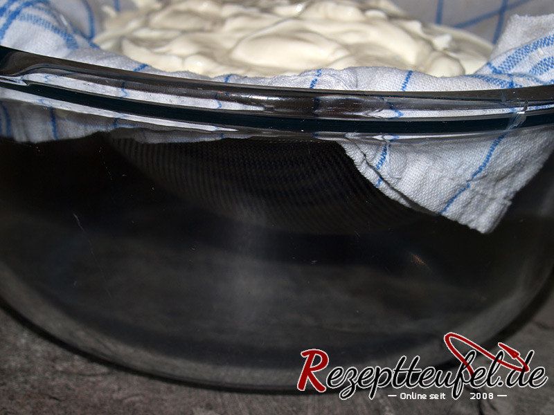 - Joghurt im Tuch welches in einem Sieb liegt