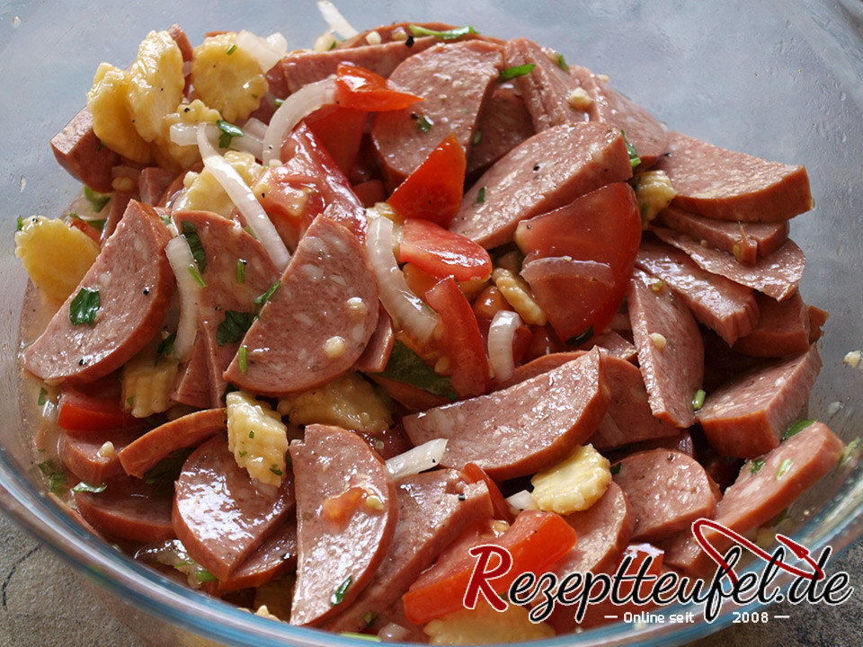 Der kräftige Krakauer Wurstsalat hat durch die verwendete Krakauer Wurst einen feinen Geschmack nach Kümmel.