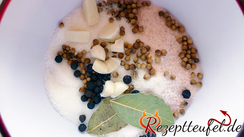 Wenn das Wasser kocht, wird das Pökelsalz und Salz inklusive den zerdrückten Gewürzen, dem Lorbeerblatt und dem Zucker hinzugefügt (Vorsicht: Die Lake schäumt in dem Moment auf).