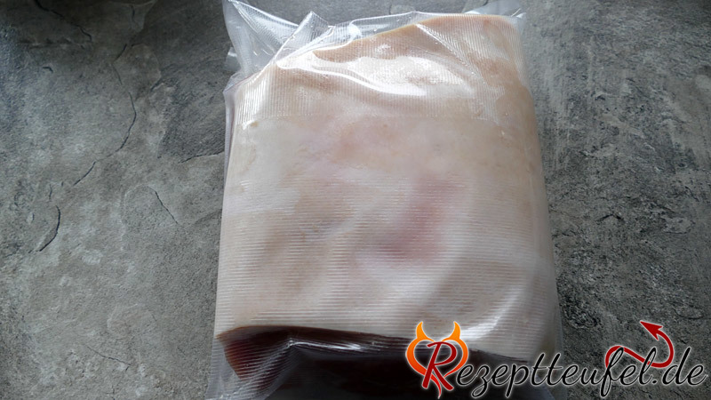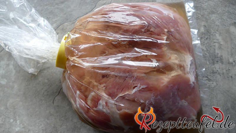Das Fleisch in eine Schale geben. Ca. 360 ml Lake in eine Marinadespritze aufziehen und gleichmäßig an mehreren Stellen in das Fleisch gespritzt.Das Fleisch in einen Vakuumbeutel oder Gefrierbeutel geben und mit der restlichen Lake übergießen. Das Fleisch sollte komplett bedeckt sein.