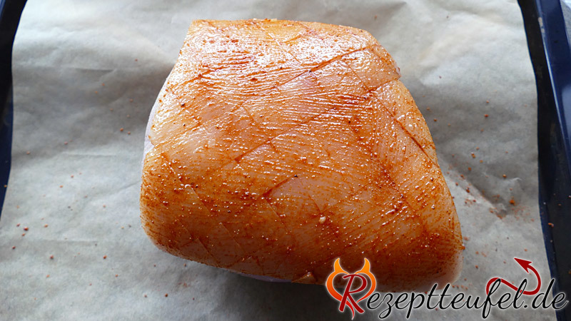 Speckschwarte mit einem scharfen Messer oder einem Skalpell rautenförmig einschneiden. Das Öl mit dem Salz, Pfeffer und Paprikapulver vermengen und auf die eingeschnittene Speckschwarte streichen. Unter der Grillfunktion bei ca. 220 °C im Backofen mit hoher Hitze bräunen, bis sich kleine Blasen auf der Schwarte bilden.