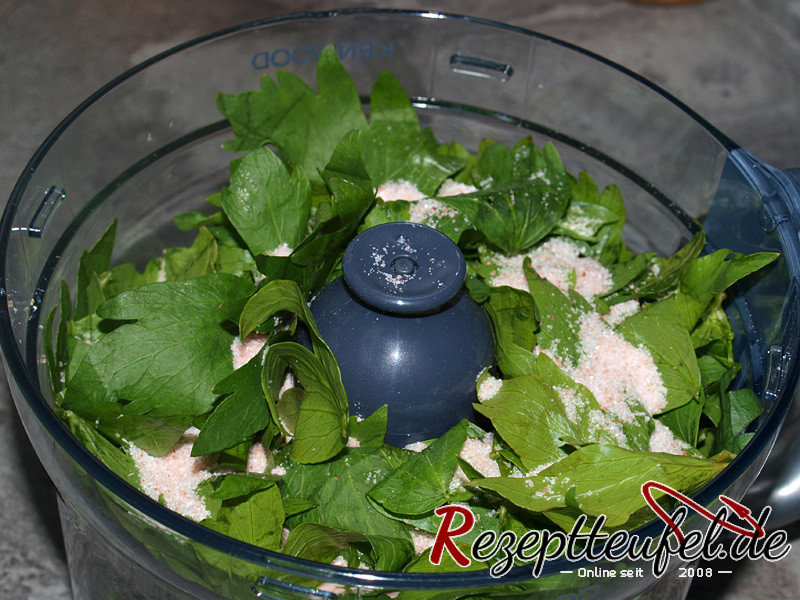 - Die Blätter vom Liebstöckel säubern (geht sehr gut in einer Schüssel mit Wasser) und dann gut abtrocknen, z. B. zwischen Geschirrtücher legen und leicht trocken rubbeln. Es sollte kein Wasser mehr am Liebstöckel haften. Eventuell mit einem Föhn die Blätter "trockenpusten".Den Liebstöckel mitsamt dem Salz pürieren und die Paste in das saubere Glas füllen. Mit dem Deckel verschließen und an einem kühlen Ort (Kühlschrank) aufbewahren.