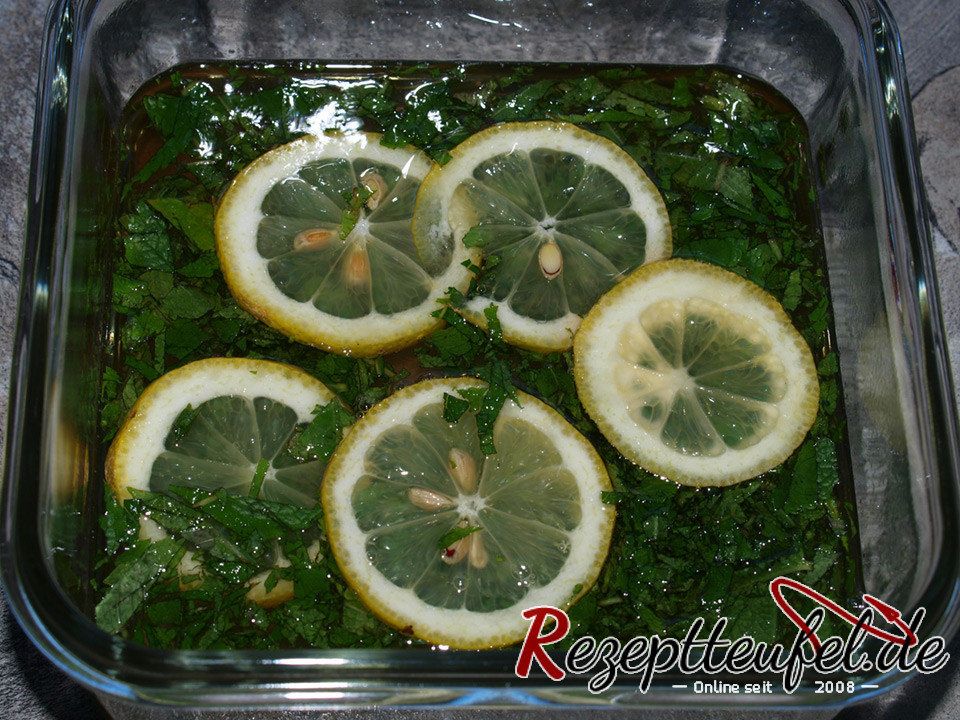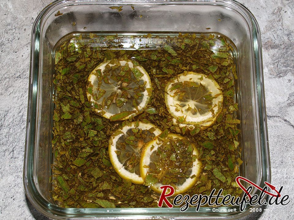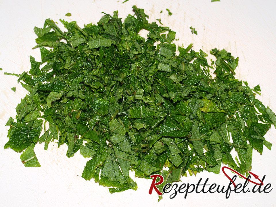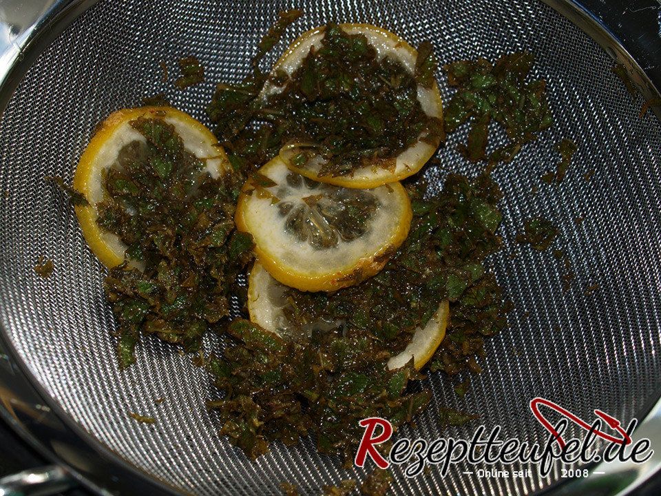 - Die Minzblätter unter fließendem Wasser abwaschen, trocken schleudern und in grobe Streifen schneiden und in eine hitzebeständige Schüssel geben, die halbe Zitrone in feine Scheiben schneiden und dieses Scheiben zu der Minze geben.15 g Minze, 0.5 Zitrone