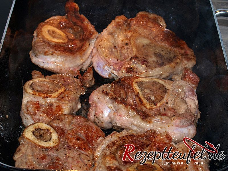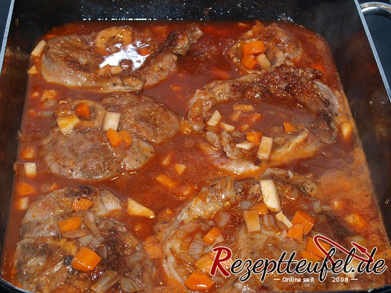 - Das Gemüse in die Pfanne geben in der vorher das Fleisch angebraten wurde und anschwitzen. Das Tomatenmark hinzufügen und anrösten. Mit der Hälfte vom Wein ablöschen und reduzieren lassen bis die Flüssigkeit fast ganz verdampft ist. Den Rest vom Wein angießen und etwas einreduzieren. Die Brühe hinzugießen, aufkochen lassen und das Fleisch hinzufügen.Das Kochgefäß mit geschlossenem Deckel im Backofen ca. 120 bis 150 Minuten garen bis das Fleisch weich ist und fast vom Knochen fällt.50 g Tomatenmark, 200 ml Weißwein, 500 ml Brühe
