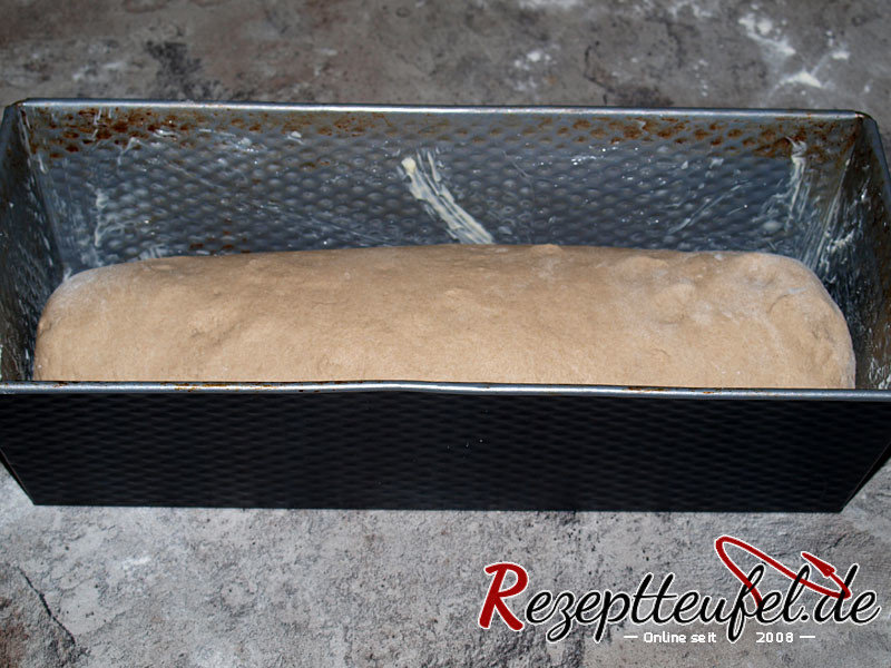 - Den Teig auf einer bemehlten Arbeitsfläche kräftig durchkneten und zu einer Rolle formen, welche die ungefähre Länge der Kastenform hat. Die Kastenform ausfetten und die Teigrolle hineingeben, zugedeckt nochmals ca. 60 Minuten gehen lassen.