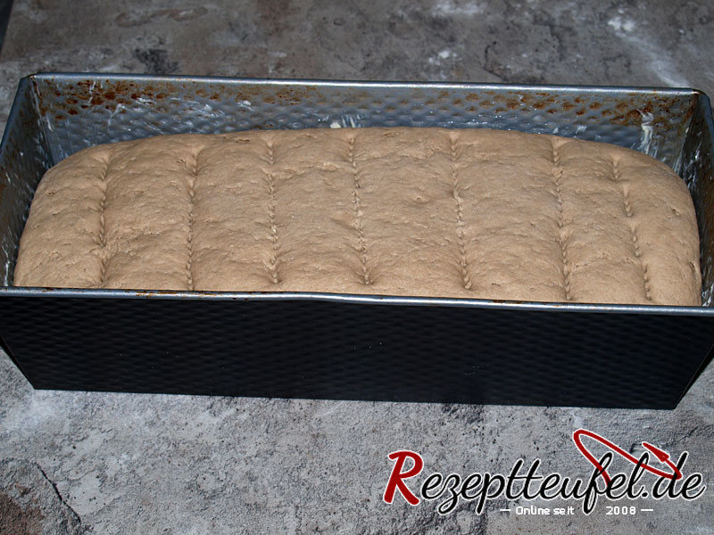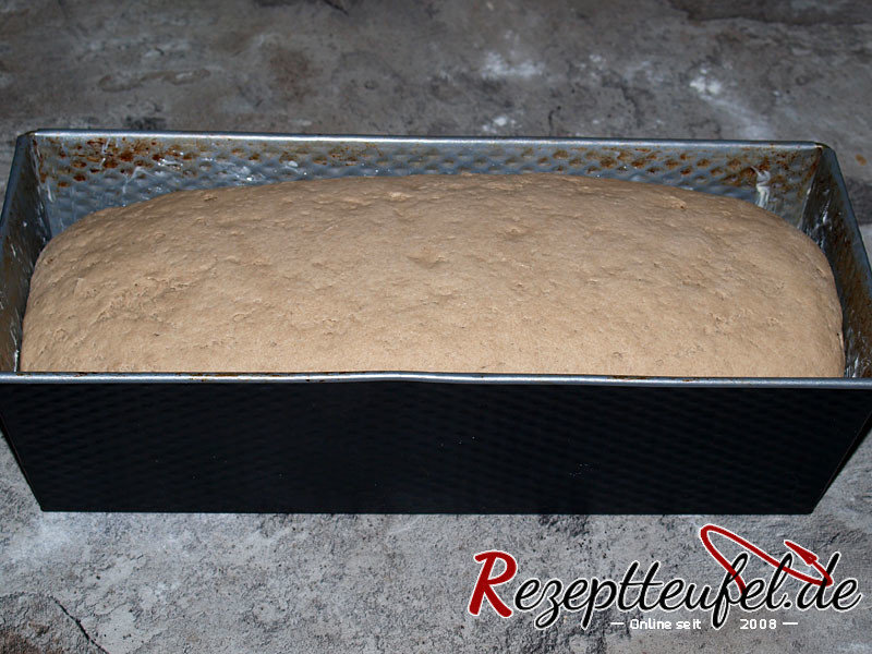 - Die Oberfläche des Teiges gut befeuchten und mit einer Gabel mehrmals ca. 1,5 cm tief einstechen. 1/2 Tasse kochendes Wasser in die Saftpfanne gießen und die Kastenform sofort auf mittlerer Schiene in den Backofen geben. Das Brot 60 Minuten bei voller Hitze (210 °C) backen.Für ein "doppelt gebackenes Brot" das Brot 10 Minuten vor Backende aus der Form nehmen und die restliche Backzeit von 10 Minuten ohne Form backen.Das Brot aus dem Ofen nehmen, aus der Kastenform stürzen und die Oberfläche mit Wasser bestreichen.