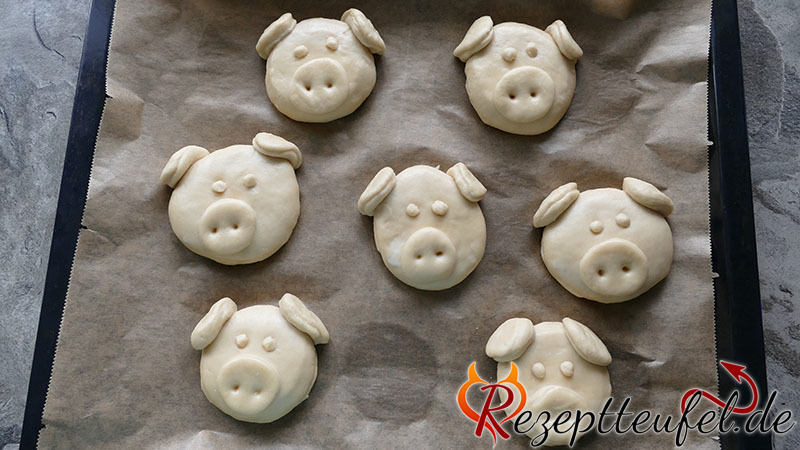 - 7 große Teigkreise mit Abstand auf ein mit Backpapier ausgelegtes Backblech legen und dünn mit Milch oder Wasser einpinseln. In die Mitte der Teigkreise etwas von der Füllung geben und mit jeweils 1 großen Teigkreis bedecken. Die Ränder andrücken (nicht plattquetschen).Die gefüllten großen Teigkreise mit Milch bestreichen und jeweils einen kleineren Kreis als "Schnauze" aufsetzen und mit einem dünnen Gegenstand die Nasenlöcher einstechen. Jeweils 2 von den kleinen Kreisen an den Rand der großen Teigkreise als Ohren auflegen, sodass die "Ohren" über den Rand hinaus gehen. Den überstehenden Ohren-Teigkreis am Rand festdrücken. Die Schweinchen an einem warmen Ort gehen lassen, sie sollten sich etwas vergrößern.