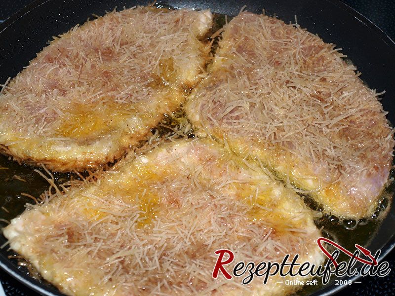 Putenschnitzel werden wird nicht mit Paniermehl, sondern mit zerbrochenen ungekochten Glasnudeln paniert