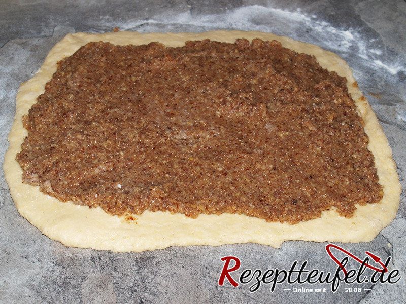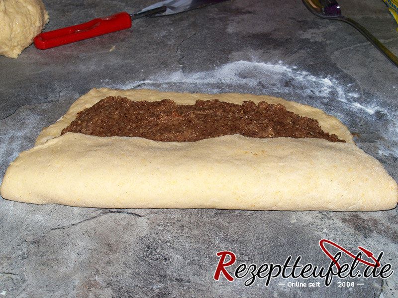 - Nussfüllung auf dem Teig verstreichen