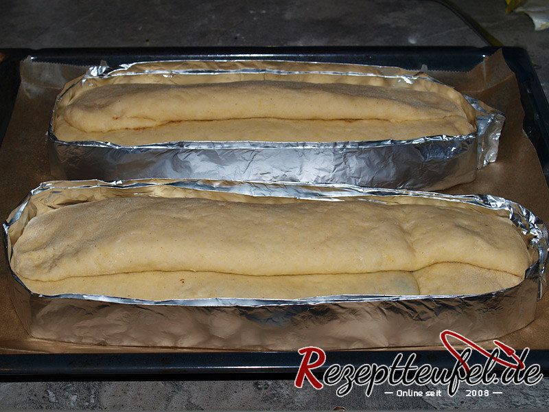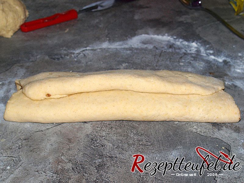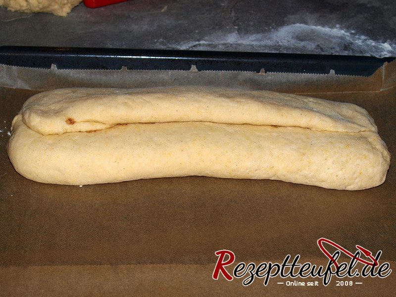 - Den Teig an den Längsseiten etwas einschlagen damit der Stollen geschlossen ist