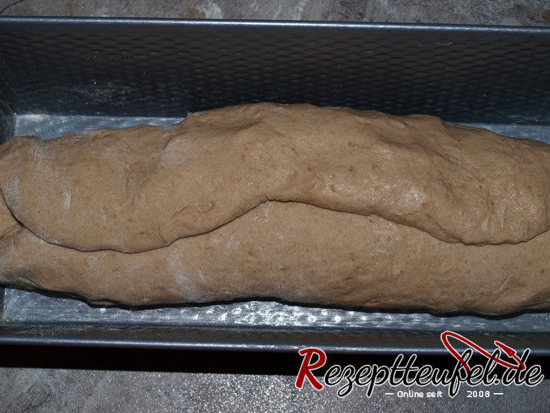 - Teig auf eine bemehlte Arbeitsfläche geben, zu einer Teigplatte in Länge der Kastenform formen und die Teigplatte aufrollen, ohne den Schluss richtig fest anzudrücken. Die Teigrolle in eine gefettete Kastenform von 35 cm Länge geben und mit Weizenmehl bestäuben.