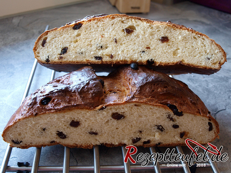 Der leicht süße Rosinensstuten beinhaltet viele Rosinen und ist leicht und locker. Er schmeckt auch sehr gut mit etwas Butter und Marmelade bestrichen.