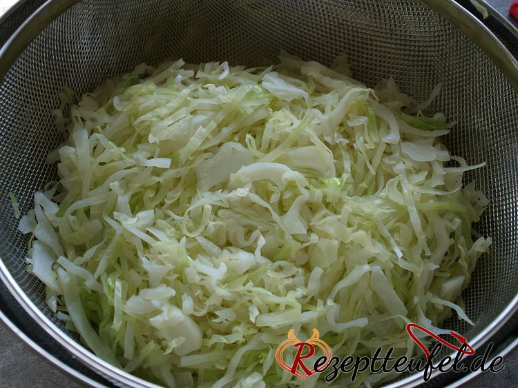 - Vom Spitzkohl die äußeren Blätter entfernen, den Kohl vierteln und den Strunk herausschneiden. Die Spitzkohlviertel in feine Streifen schneiden oder hobeln und 3 Minuten in kochendem Wasser leicht vorgaren.300 ml von dem Einkochwasser zu Seite stellen. Den Spitzkohl in ein Sieb geben und abtropfen lassen.1250 g Spitzkohl