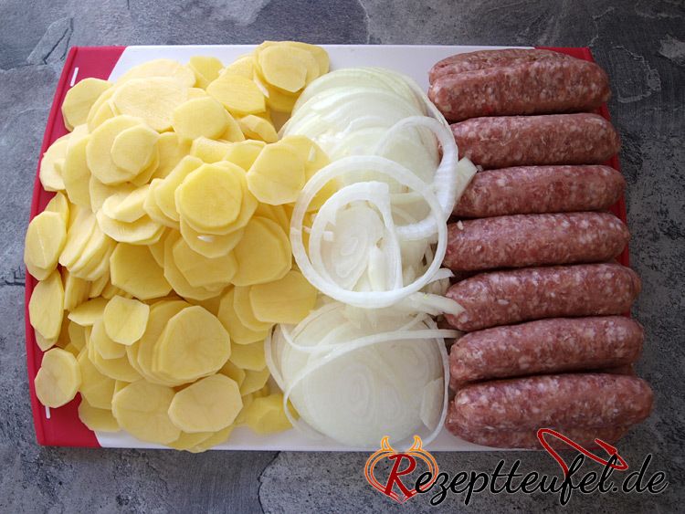 - Vorbereitete Kartoffeln, Zwiebeln und Bratwurst