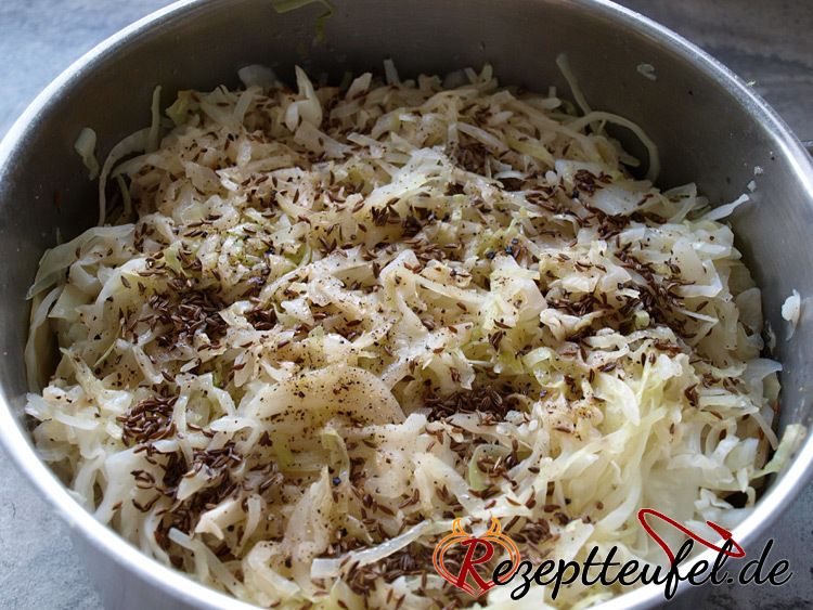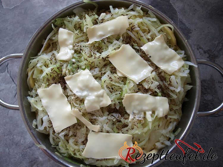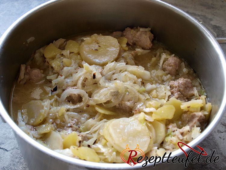 - Die Hälfte des vorgebrühten Spitzkohls in einen großen Topf geben, mit Salz und Pfeffer würzen, 1 TL Kümmel darauf verteilen.Darauf zuerst die Hälfte der Kartoffeln schichten, mit Salz und Pfeffer würzen, dann die Hälfte der Zwiebelringe.Die Bratwurst zerrupfen und als nächste Schicht darauf geben.Jetzt die restlichen Zwiebelringe, dann die Kartoffelscheiben und zum Schluss den restlichen Spitzkohl schichten.Salz, schwarzer Pfeffer, 1 TL Kümmel